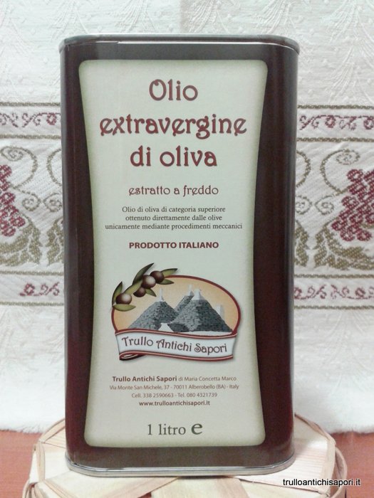 Olio extravergine di oliva prima spremitura a freddo. Ottenuto da macinazione di olive del territorio. Prodotto ad Alberobello. 100% italiano Lattina da 1 litro.