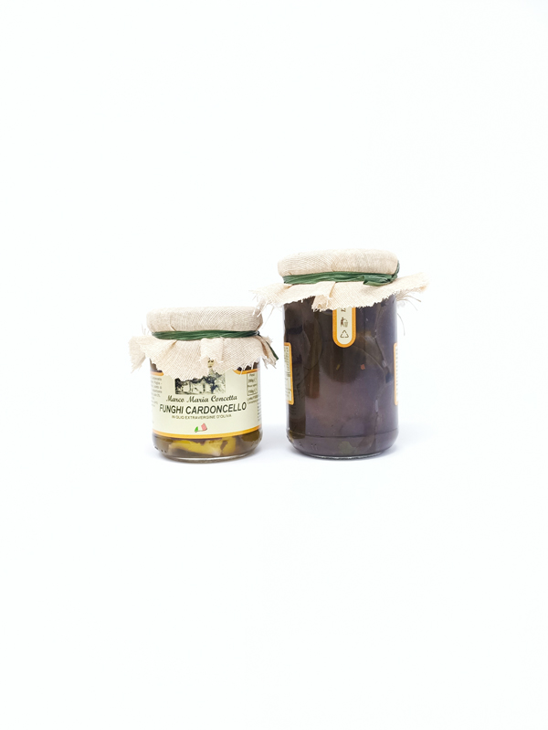 Funghi Cardoncello Funghi Cardoncello, prima acidificati in aceto di vino , poi conservati in solo Olio extra vergine d'oliva estratto a freddo. Produzione locale e artigianale Vasetti da 200 gr., 300 gr., 500 gr. o 1 kg.