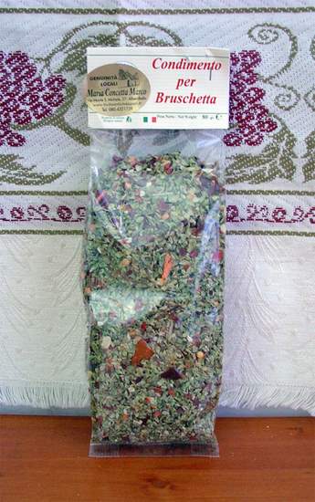 Condimento per Bruschette Misto di erbe secche (aglio, peperoncino piccante frantumato, origano, pepe nero, sale) pronte per condire le bruschette, la pizza, focaccia, etc. Bustine da 60 gr.
