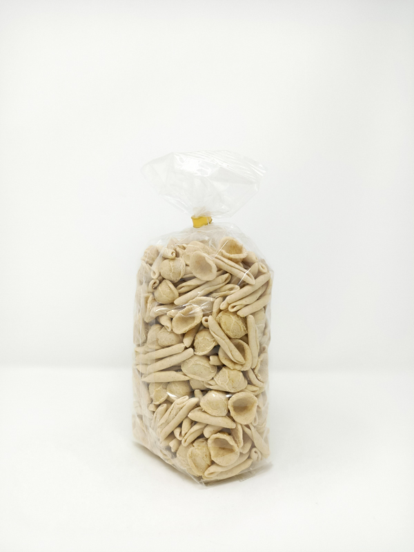 Maritati di semola di grano duro integrale I Maritati sono l'unione di due tipici formati di pasta pugliese: le orecchiette e i fricelli Produzione locale e artigianale Confezione da 500 gr.